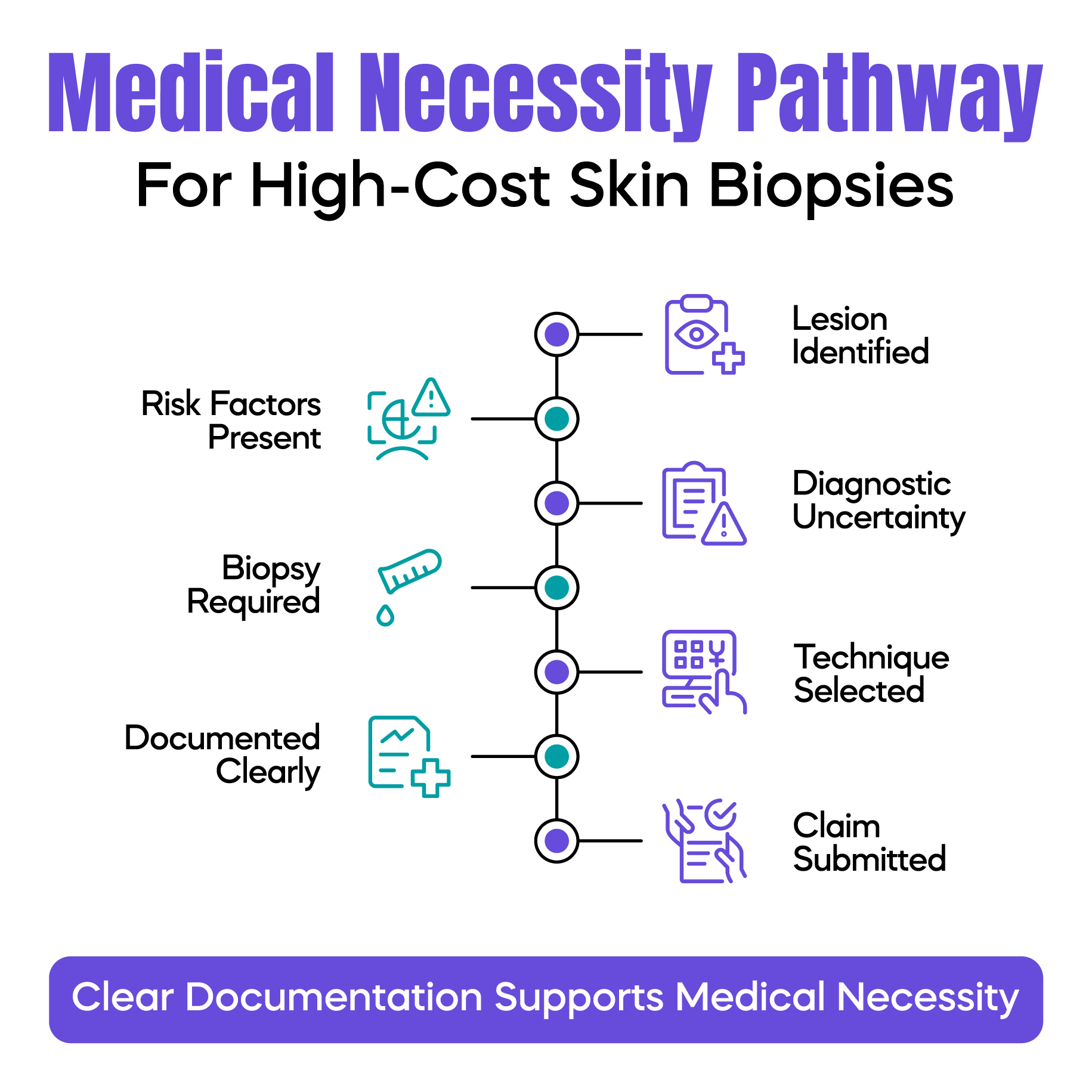 Medical necessity in dermatology refers to the requirement for a biopsy to diagnose, confirm, or rule out a condition that cannot be safely or effectively managed through observation alone. The documentation must show that the lesion raised legitimate concern and that the biopsy outcome would influence patient management.